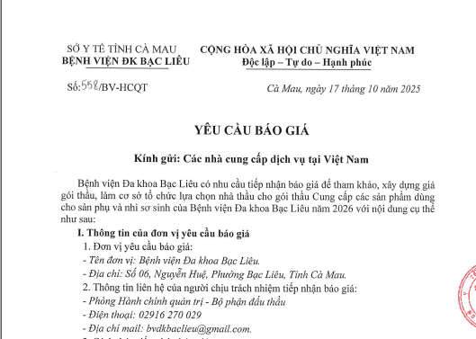 Thứ 6, 17/10/2025 | 09:10 A- A A+ | YÊU CẦU BÁO GIÁ CÁC SẢN PHẨM DÙNG CHO SẢN PHỤ VÀ NHI SƠ SINH CỦA BỆNH VIỆN ĐA KHOA BẠC LIÊU NĂM 2026 (17/10/2025) 558_810471bb91.pdf , PHU_LUC_4c94a2d017.docx Đọc bài Lưu YÊU CẦU BÁOGIÁ CÁC SẢN PHẨM DÙNG CHO SẢN PHỤ VÀ NHI SƠ SINHCỦA BỆNH VIỆN ĐA KHOA BẠC LIÊU NĂM 2026 (17/10/2025) Tập tin đính kèm Tập tin đính kèm Trình duyệt không hỗ trợ iframe. Tổng số điểm của bài viết là: 0 trong 0 đánh giá Click để đánh giá bài viết