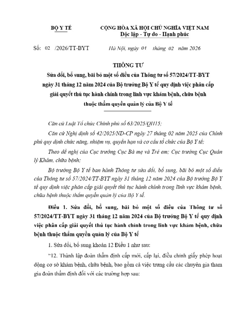 | Tiêu đề văn bản | Thông tư 2/TT-BYT 2026 sửa đổi, bổ sung, bãi bỏ một số điều của Thông tư 57/2024/TT-BYT về phân cấp giải quyết thủ tục hành chính trong lĩnh vực khảm bệnh, chữa bệnh | ||