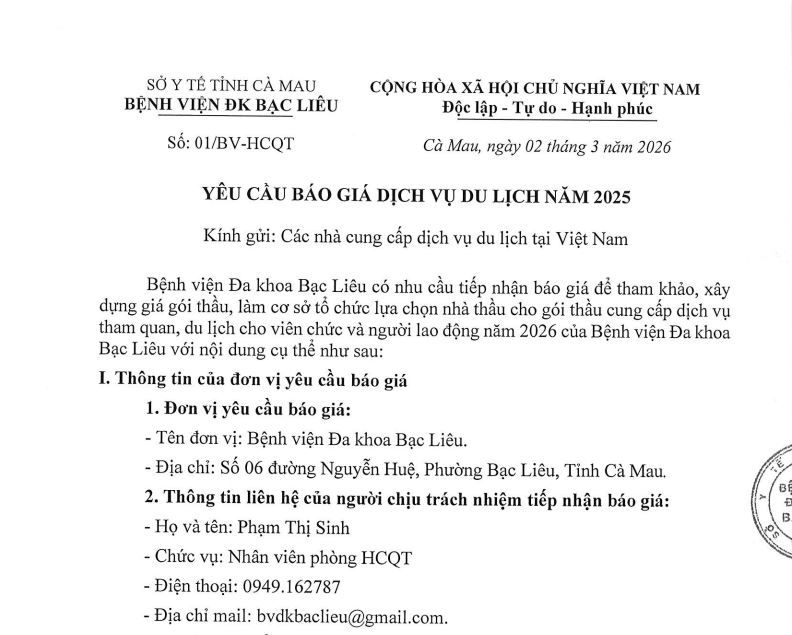 YÊU CẦU BÁO GIÁ GÓI THẦU CUNG CẤP DỊCH VỤ THAM QUAN, DU LỊCH CHO VIÊN CHỨC VÀ NGƯỜI LAO ĐỘNG NĂM 2026 CỦA BỆNH VIỆN ĐA KHOA BẠC LIÊU