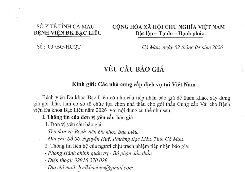 Thứ 6, 03/04/2026 | 17:14 A- A A+ | YÊU CẦU BÁO GIÁ GÓI THẦU CUNG CẤP VẢI CHO BỆNH VIỆN ĐA KHOA BẠC LIÊU NĂM 2026 03_8a723e45ee.pdf , PL_BG_GOI_VAI_2026_c578a3440a.docx Đọc bài Lưu YÊU CẦU BÁO GIÁ GÓI THẦUCUNG CẤP VẢI CHO BỆNH VIỆN ĐA KHOA BẠC LIÊU NĂM 2026 Tập tin đính kèm Tập tin đính kèm Trình duyệt không hỗ trợ iframe. Tổng số điểm của bài viết là: 0 trong 0 đánh giá Click để đánh giá bài viết