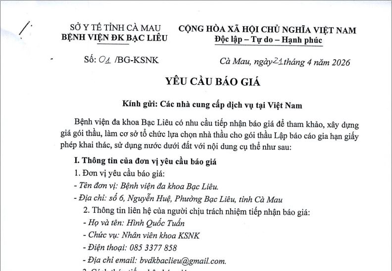 Thứ 3, 21/04/2026 | 10:48 A- A A+ | YÊU CẦU BÁO GIÁ GÓI THẦU LẬP BÁO CÁO GIA HẠN GIẤY PHÉP KHAI THÁC, SỬ DỤNG NƯỚC DƯỚI ĐẤT bao_gia_0001_e9430b26e8.pdf Đọc bài Lưu YÊU CẦU BÁO GIÁ GÓI THẦU LẬP BÁO CÁO GIA HẠN GIẤY PHÉP KHAI THÁC, SỬ DỤNG NƯỚC DƯỚI ĐẤT Tập tin đính kèm Tổng số điểm của bài viết là: 0 trong 0 đánh giá Click để đánh giá bài viết